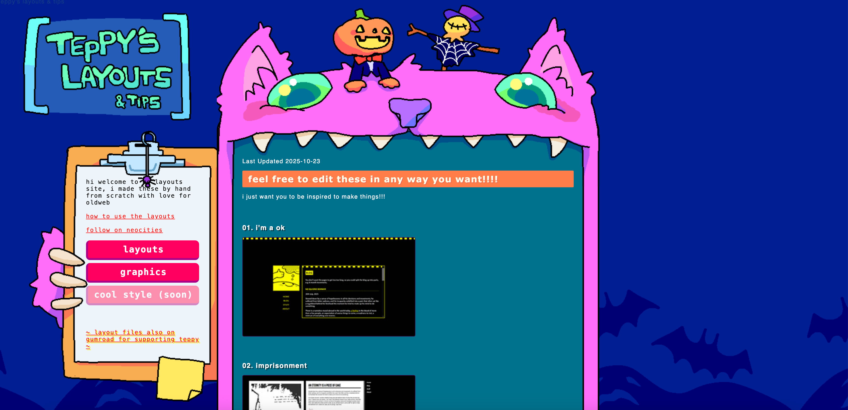 Neocities Frankensteins → View the source code of a hand-made Neocities page, steal a snippet, and drop it into your own. Make your own website!!!!