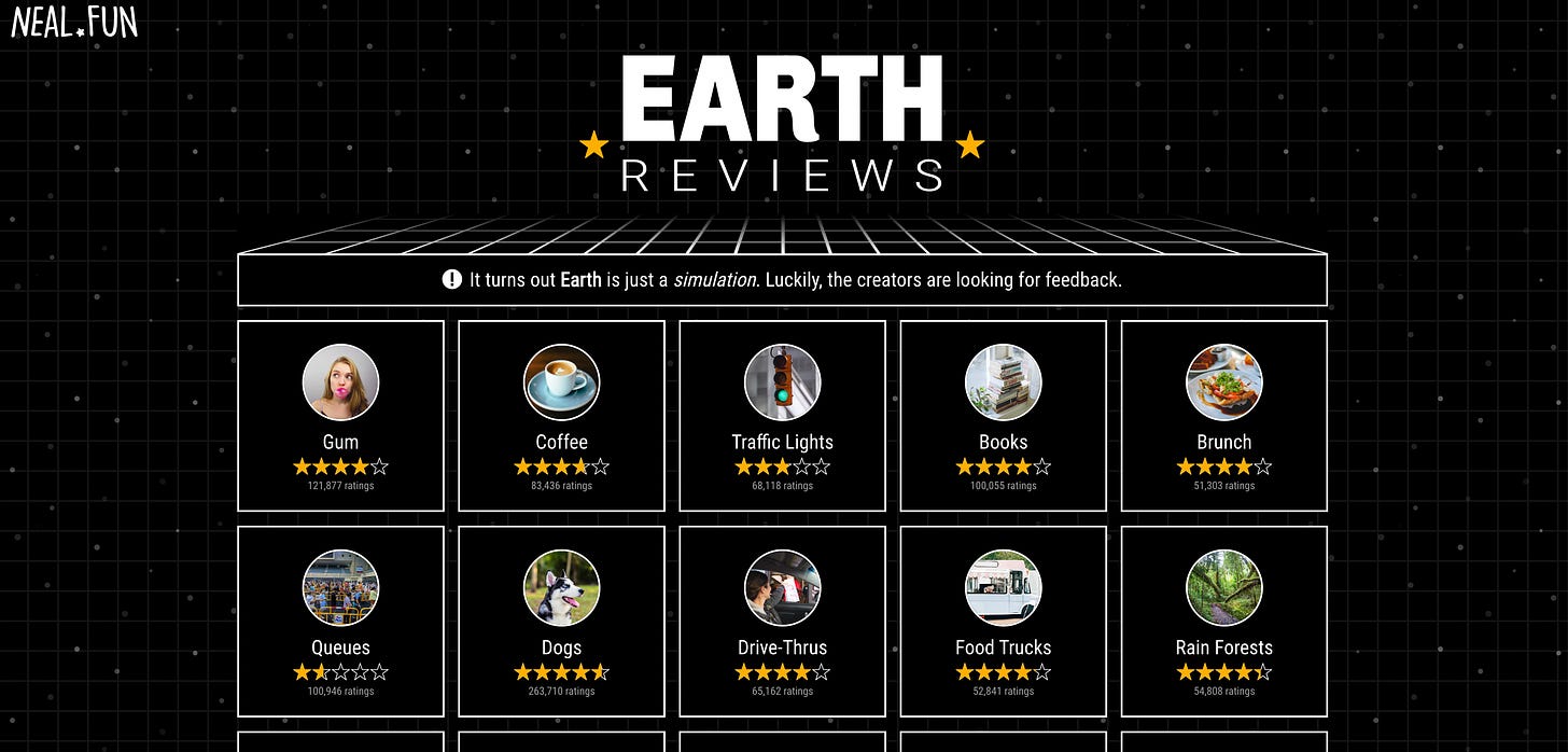 neal.fun → A collection of internet toys for your brain. Rank things no one asked you to rank (“Earth Reviews3”), solve absurd moral dilemmas (“Trolley Problems”), or waste fake government money like a reckless billionaire.