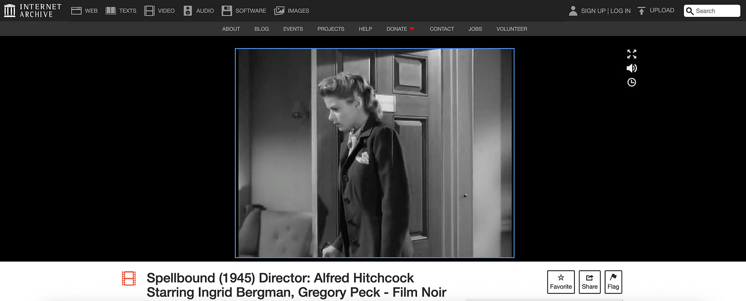 Archive.org → A time machine of dead sites, VHS tapes, and zines. This is also a great place for old movies! Currently watching: Spellbound